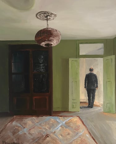 "Skeleton in the Cupboard" 2026. Acrylic on canvas. 40cm x 50cm