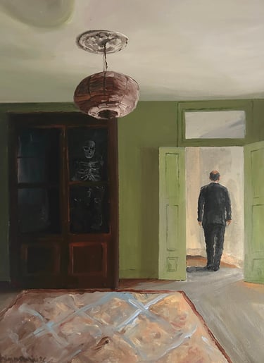 Over the years, Martin has been granted rare access to some of the most magnificent country estates in Britain and beyond - hidden gems of cultural and historical importance. These interiors, rich in period detail and filled with museum-quality furnishings, often served as more than just visual inspiration. They were inhabited by individuals whose sophisticated taste and genteel charm frequently masked layers of complexity and mystery. These encounters sparked a deeper artistic exploration, as Martin began to weave psychological nuance and narrative intrigue into his depictions of space—turning rooms into quiet stages where stories wait to unfold.